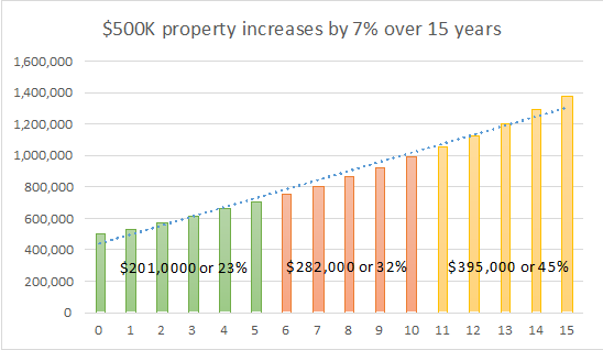 As you can see from the graphic below, if your $500,000 investment property increases in value by 7% per annum, it will be worth almost $1.4 million in 15 years’ time, but almost half of this capital growth will occur in the last five years.