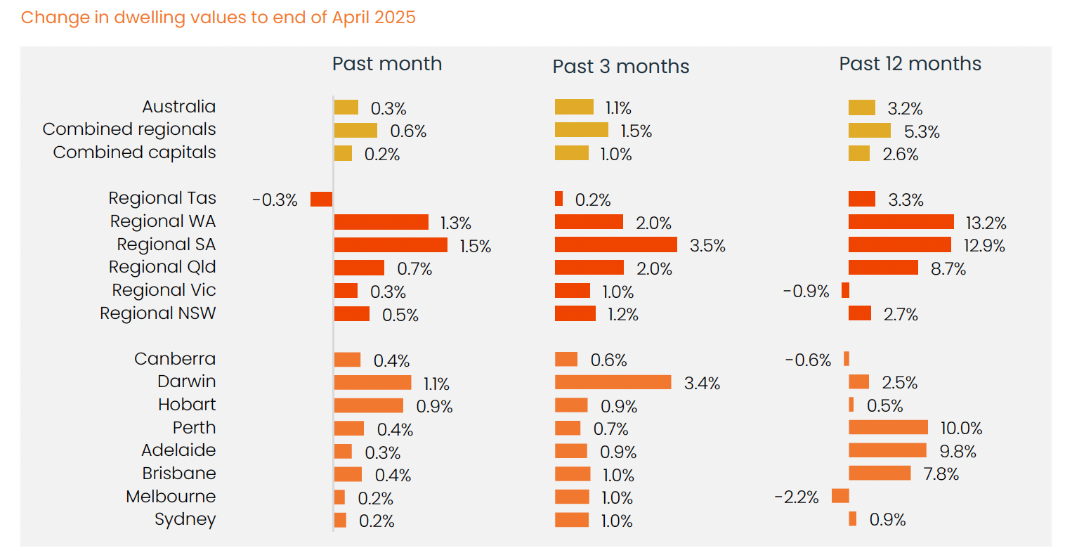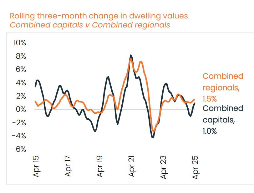 Regional housing values have continued to outpace the capitals, with values up 0.6% and 0.2% respectively over the month of April.