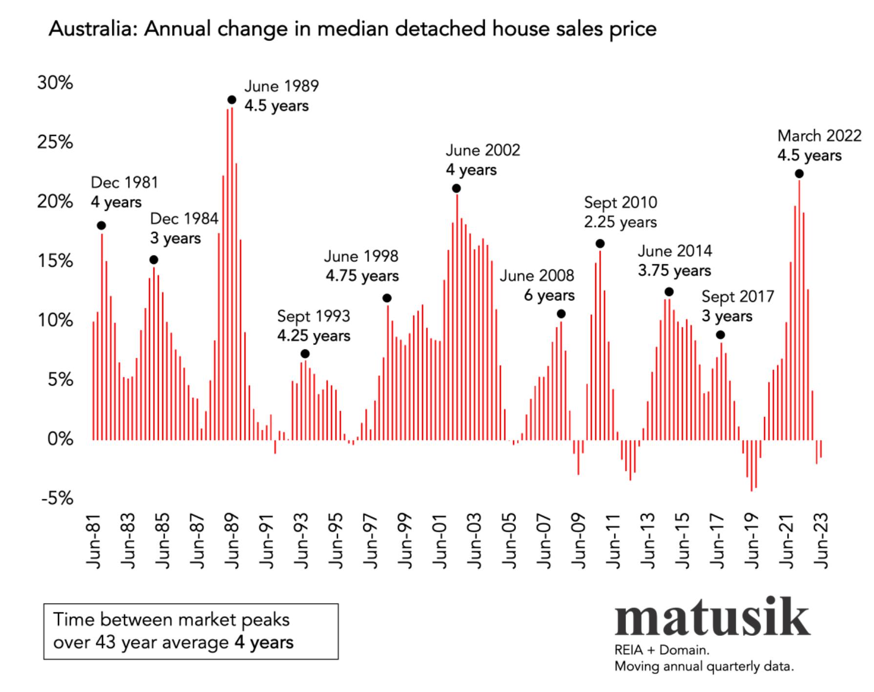 While you’ll often hear that property cycles last seven to 10 years, and while that may be the case for individual state property markets, the following chart from Michael Matusik shows that since 1980 the "overall Australian property market" peaked every 4 years or so.