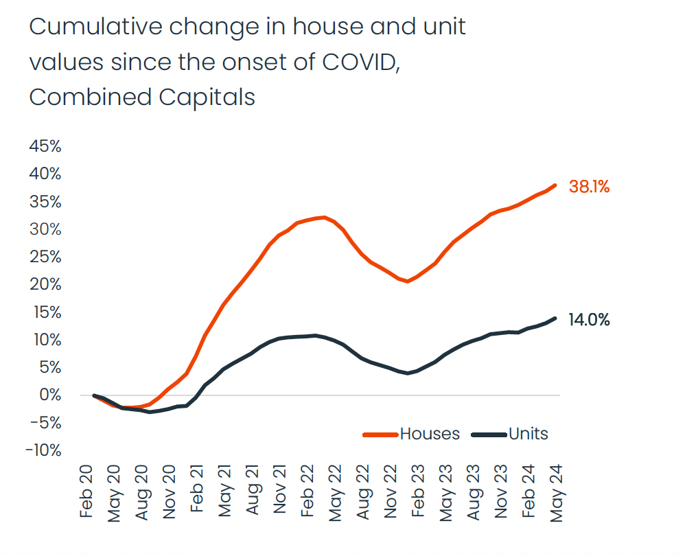 Capital city house values rose almost 3 times as much as unit values since the onset of Covid... but the gap is narrowing across most cities.