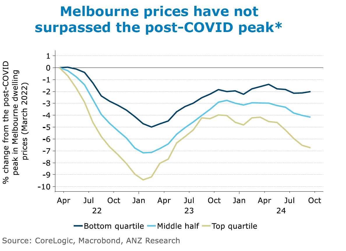 Melbourne dwelling prices remain below their 2022 peak, and more affordable properties (in the bottom quartile) have outperformed over the last few years.