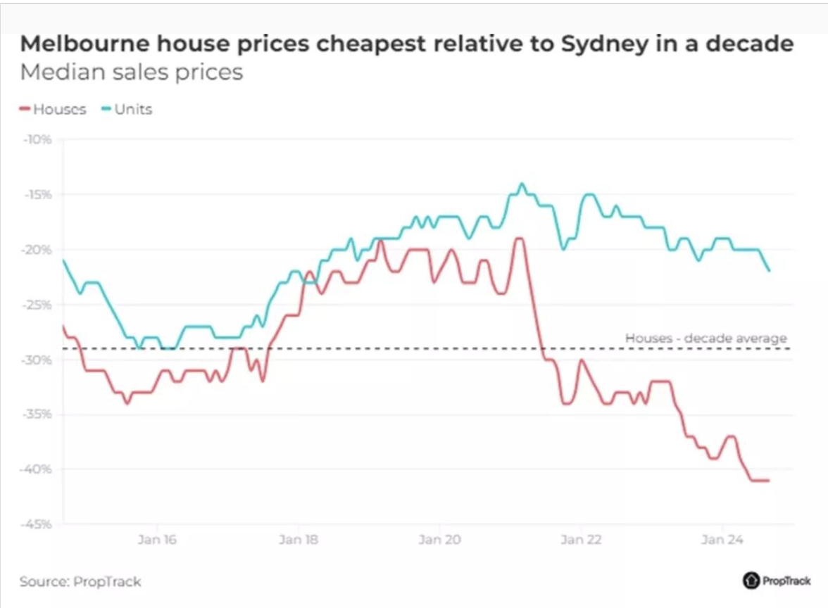 The average price of a Melbourne standalone house is the lowest it has been against its Sydney equivalent in around twenty years.