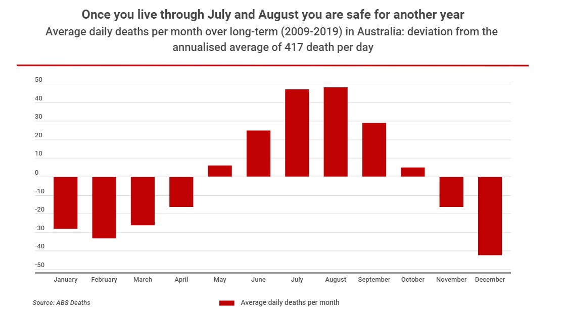 Whereas in warm summer months particularly around Christmas we have much fewer deaths per day recorded.