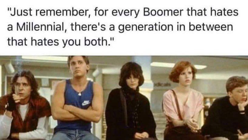 They are still pretty sarcastic and skeptical of the world because they view the elders with a bit of suspicion, and this generation's cynicism is, of course, famously captured by Chandler Bing in Friends (Matthew Perry who played the role is, of course, Gen X himself), and this is the quintessential Gen X TV show: