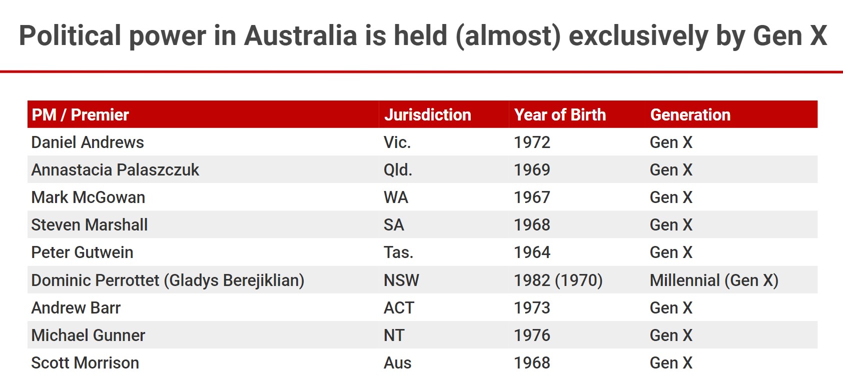 Already, every single Prime Minister and Premier in Australia is a Gen X or almost everyone.
