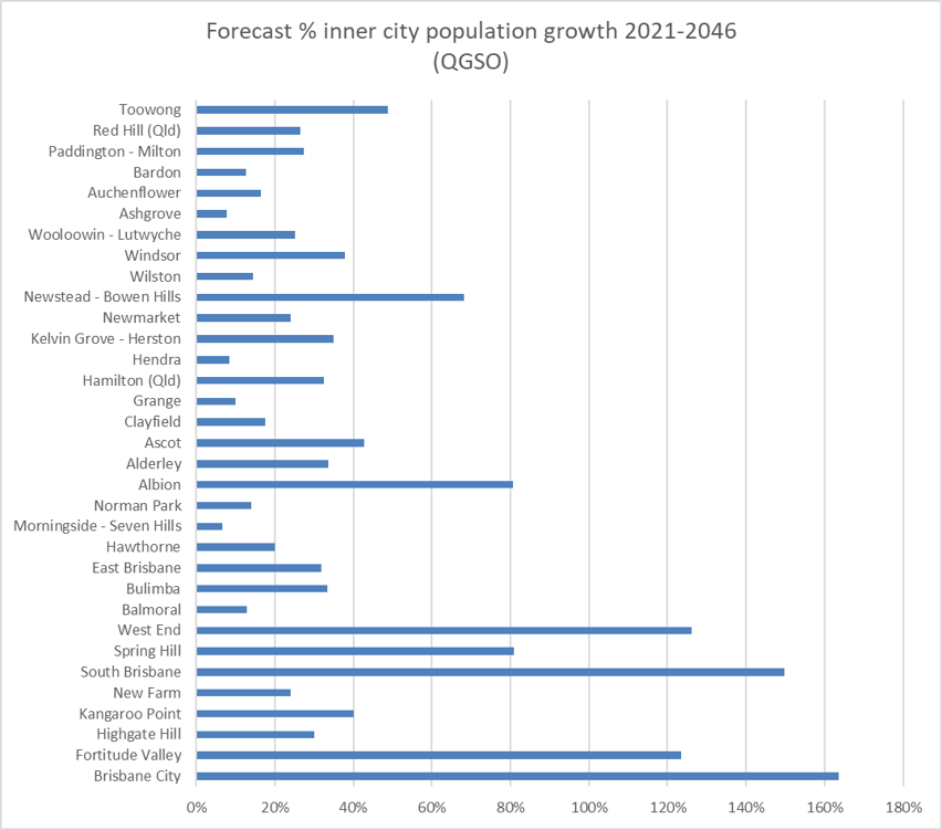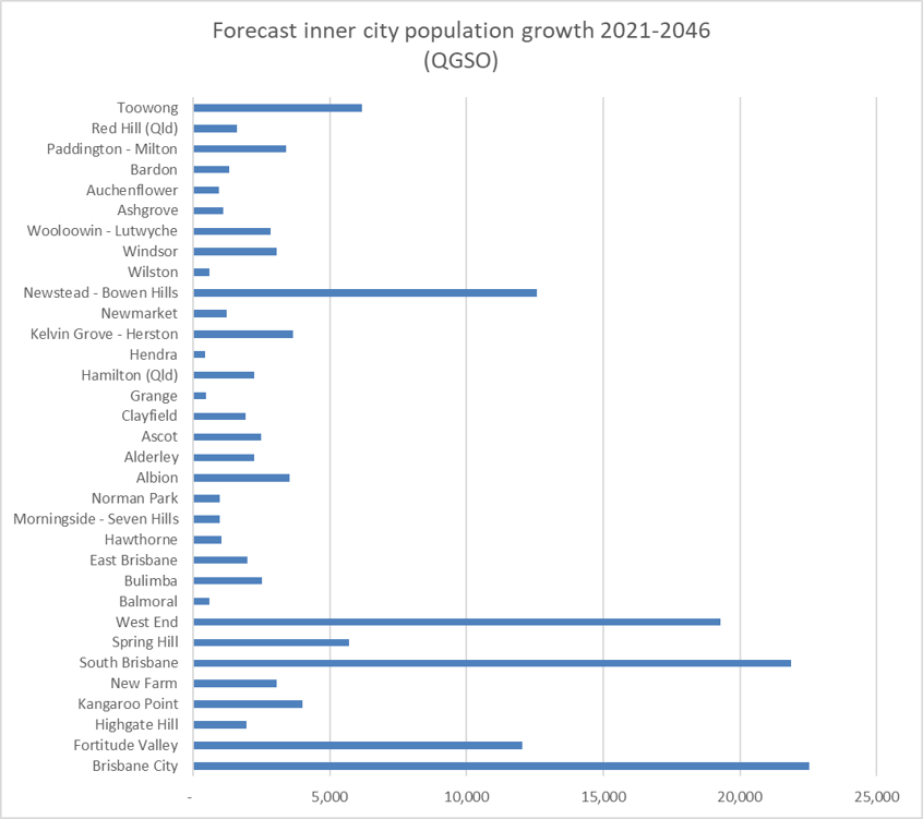 This graph shows where within the inner city of Brisbane the population is expected to change, and by how much, in the 2021-2046 period.