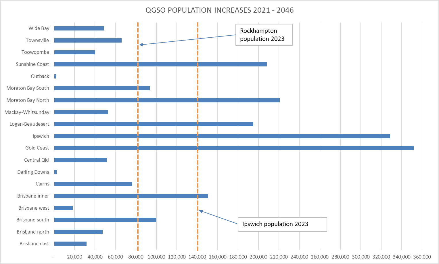 I have added a couple of lines to show how these predicted increases compare to the current populations of Rockhampton and Ipswich, just for context.