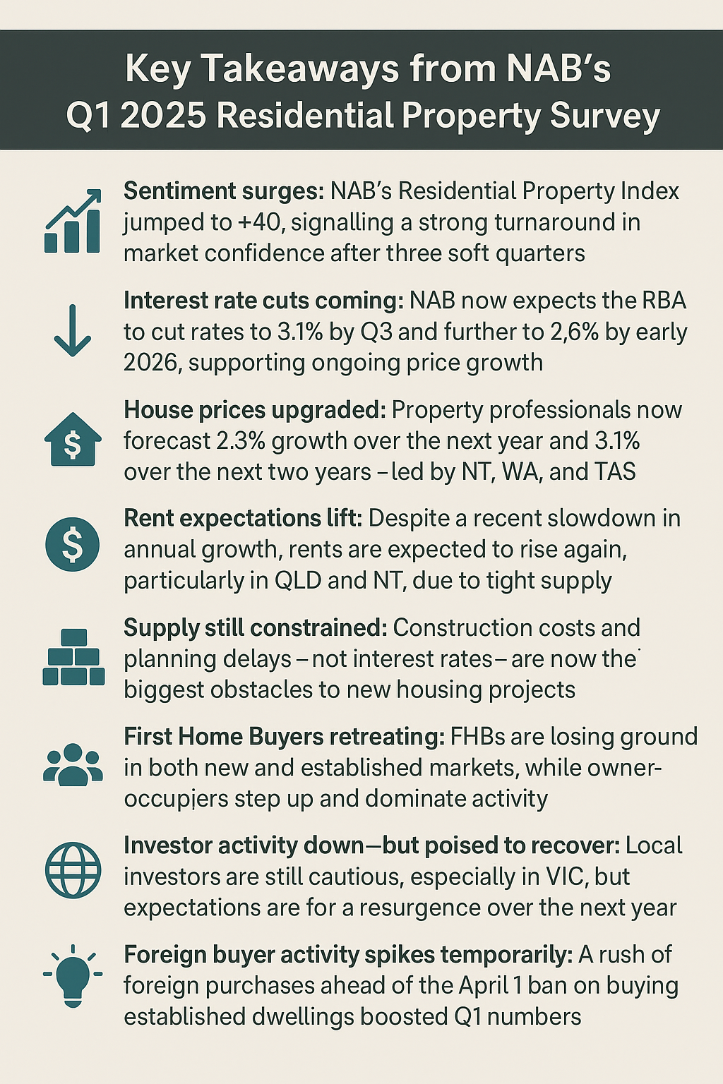 Sentiment surges: NAB’s Residential Property Index jumped to +40, signalling a strong turnaround in market confidence after three soft quarters.