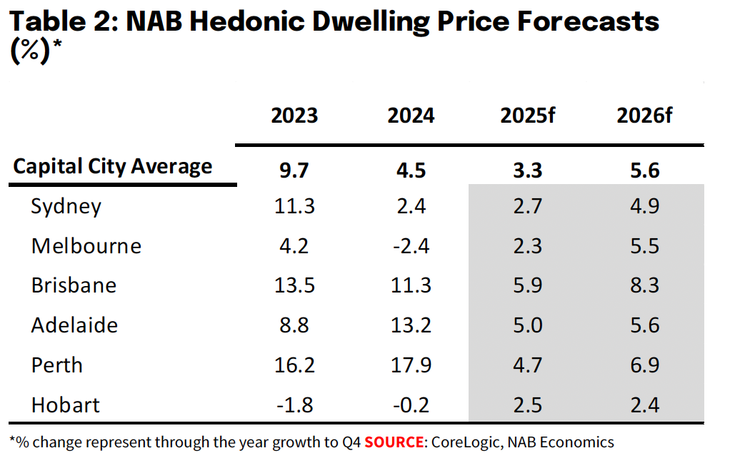 NAB now expects capital city dwelling values to rise by 3.3% in 2025 and a stronger 5.6% in 2026, with falling interest rates providing much of the tailwind.