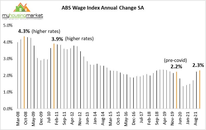 Despite the recent covid-related spike in inflation, the RBA has consistently stipulated that any action to raise official rates is dependent - as usual, on sustained annual wages growth above its 3% target.