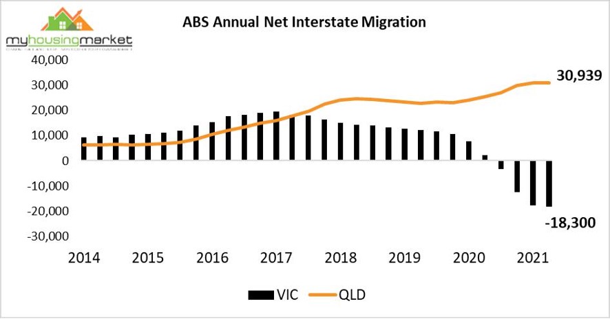 The ABS reports that Victorian net interstate migration fell by 18,300 over the year ending June 2021 – the lowest result since the year ending September 1995.