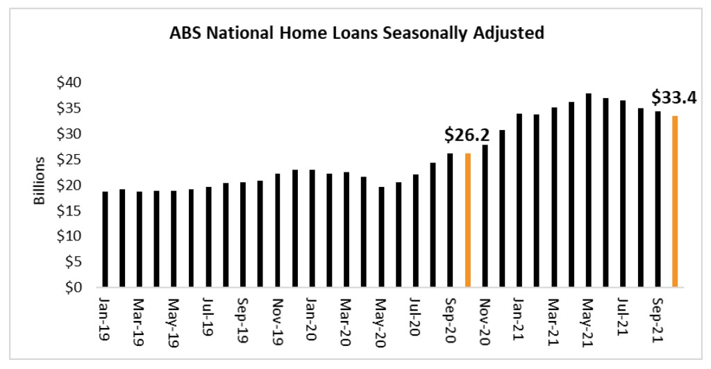 The ABS reports that the value of home loans seasonally adjusted (excluding land and alterations and additions) fell by 2.9 % over October compared to the previous month but remains 27.6% higher than reported over October 2020.