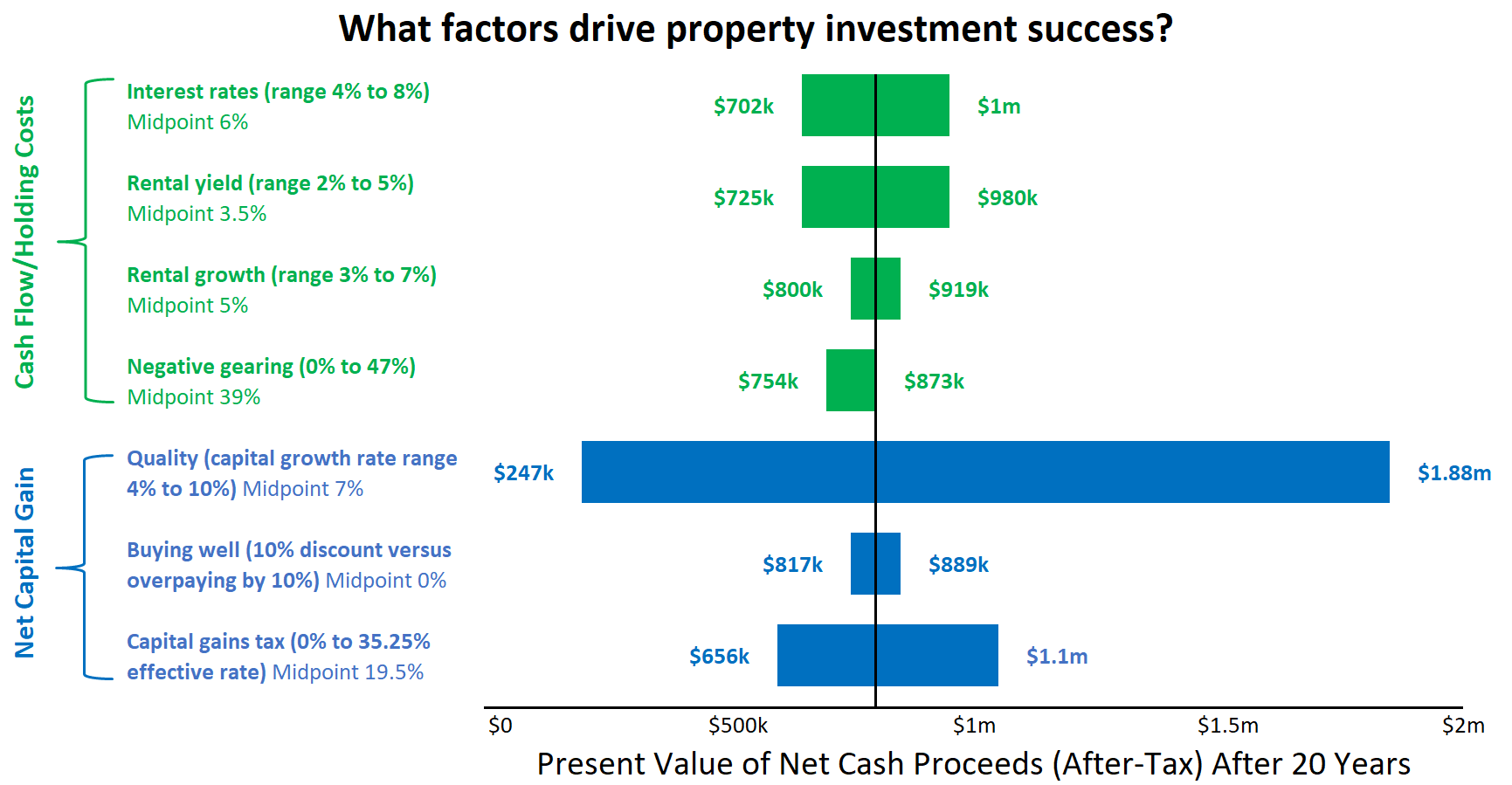 What I did is held all factors the same (i.e. at the midpoint/base case) and changed one variable from high to low to measure the impact on after-tax cash (assuming you hold the investment property for 20 years and then sell it).