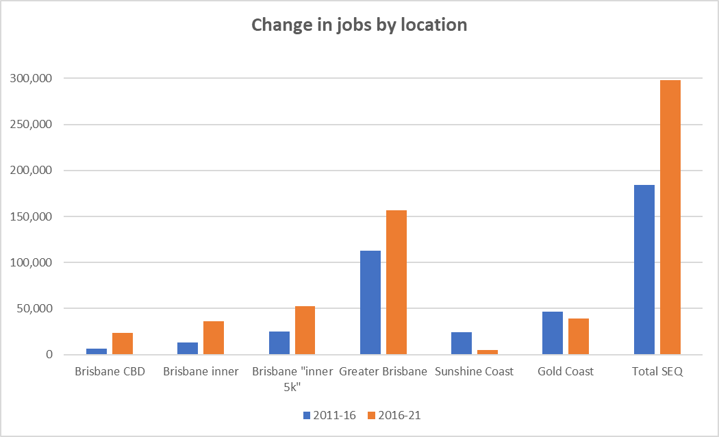 The graph below shows total job numbers for Southeast Queensland by location based on the Census results of 2011, 2016, and 2021.